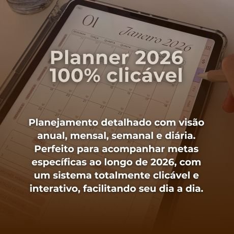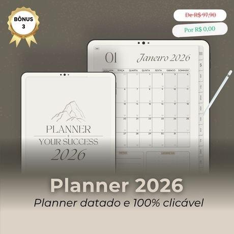 O Planner Your Success se adapta ao seu momento porque ele não é datado. E, para quem prefere datas, a versão 2026 está incluída, totalmente clicável e pronta para usar.